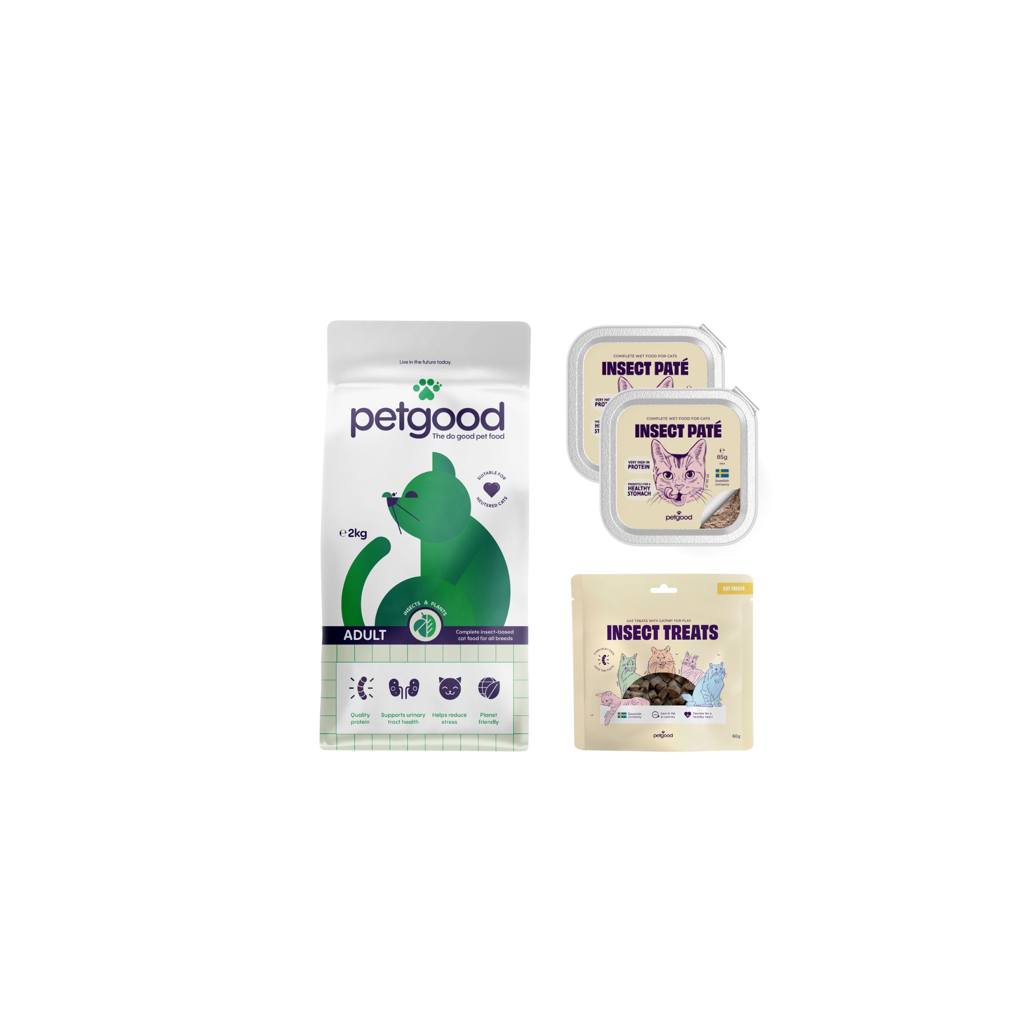 Startpaketet för katt innehåller 2 kg premiumfoder, två burkar våtfoder och en påse kattgodis.
