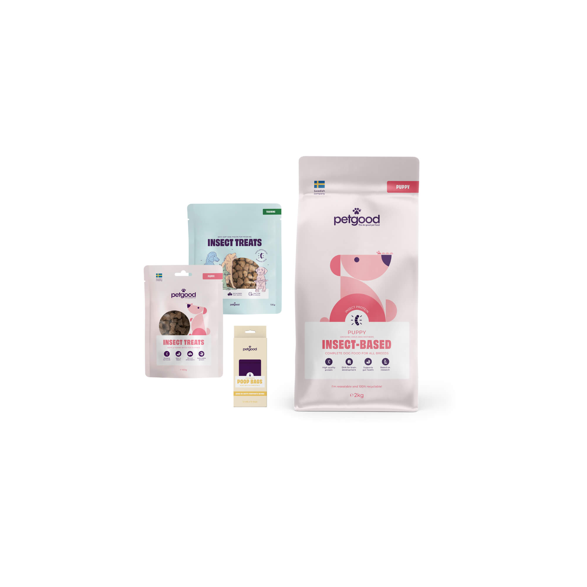 Startpaketet för valp innehåller 2 kg premiumfoder för valp, en påse träningsgodis, en påse valpgodis och en förpackning miljövänliga bajspåsar