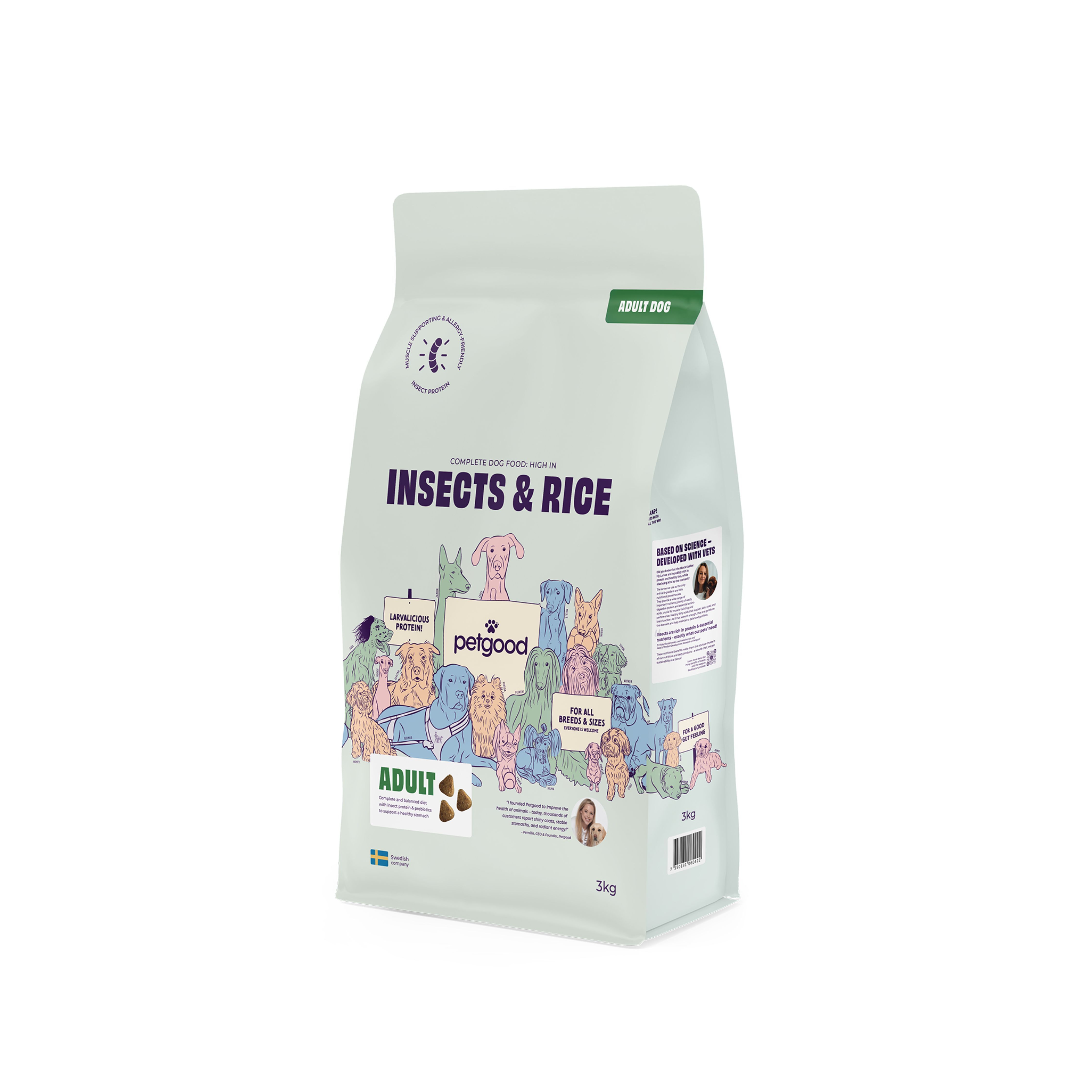 Komplett och balanserat torrfoder för vuxen hund, med insektsprotein och lättsmält ris. Innehåller prebiotika för att stötta mag- och tarmhälsa. Fodret är definitionen av prisvärd hälsa!